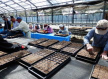 ユリの里のハウス内で 今年も部会を中心に 花苗の種まきを行いました。