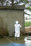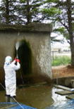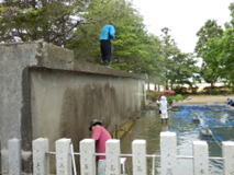 コミセン前の池の泥上げ清掃 壁を高圧洗浄機で汚れを落としました。