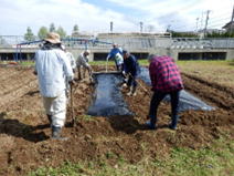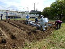 5/4 先生方も加わり 畝にマルチシ-トを 通路には防草シートを張りました。