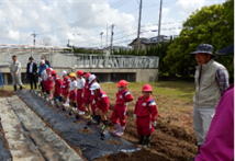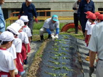 5/7 2年生とふたばの子供たちと オクラ キュウリなどの5種類の夏野菜の苗を植えました。