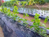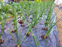 昨日までにナス、ピーマン、万願寺、ししとうは全て撤去して肥料を入れて耕し、黒マルチを張った畝を作っておきました。雨が続いていましたが何とかできました。ポットまきのスナップエンドウがやっと伸びてきたので、この畝の1/3の部分に植え付けました。棚にはきゅうりのネットを張りました。きれいに歪まずたるまずにネットを張るのは結構なコツが要ります。空豆のポット苗は葉を広げているものもありますが、全然葉を出していないものもあり育ちはまちまちです。豆は触ると固く、腐ってはいないので様子を見ます。玉葱の苗は元気です。株元の穴にそさい3号を5粒ほど入れ、その上に牛糞たい肥を被せておきました。これで暖かさが増して元気も増します。白蕪はまだ小さいですがよい育ち方をしています。虫が減り、葉も密集してきたので白蕪、赤蕪の防虫ネットは外しました。 |