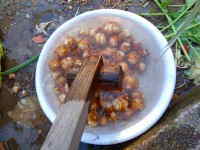 今年は夏に雨が降らなかったので、田芋というくらい水を欲しがる里芋にとっては過酷な夏でした。こまめに水をやっていましたが追い付きませんでした。10月になってやっと元気が出てきましたが、流石にもう収穫期なので掘り出しました。やはり芋は小さかったのですが、小さいなりに数が多かったので根を切ったり、芋洗いをして皮を外したりするのが大変でした。自作の芋洗い棒でゴシゴシしますが、その前に芋の根を切って、出っ張った部分は削り落として丸くしておかないと芋洗い棒の効果が半減してしまいます。昨夜は先ずはころ煮をしましたが大野の上庄の種芋だけあって粘りがあって美味しい芋でした。今夜は小粒の芋をレンチンして火を通した後、串に刺し塩胡椒して天ぷらにしました。これもしっかり美味しかったです。今年はいまいちの出来でしたが、来年も懲りずに里芋栽培を続けます。