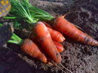 やっと玉葱苗を全て植え付けました。430本です。苗床の苗に追加して150本購入しました。スナップエンドウはポットに4粒ずつまきました。早く成長すると冬越ししにくくなるのでゆっくり育てます。ここのところ恐ろしく寒いので空豆はまだ双葉が割れていません。こちらはもう少しスピードアップしてほしいです。人参を間引いて施肥。収穫した小さい人参は水、砂糖とバターで煮てグラッセにしました。人参の味が濃くて美味しいです。最低気温が10℃近くになってきたのでナスは全て撤収しました。耕して空豆の畝にします。それにしてもまだ10月だというのに寒すぎです。今年の冬は寒そうで心配です。 |