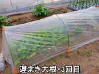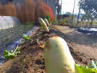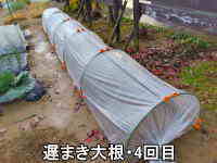 今日は最悪の天気であられが降っています。畑の作業は昨日のうちにほぼ完了させておきました。大根は僅かを残して収穫。おすそ分けも完了。畑に残った物は首切りをしてすが入らないようにしました。葉を少しでも残すとそこから葉が出てくるので成長点の下で切り落とすのが肝要です。大根は最後の種まきをしました。これで今年4回目です。2回目は少し太ってきました。3回目は間引かないといけませんが葉が固くなってきました。今回の4回目はビニールトンネルで保温です。まき時期が遅すぎなので目が出るかどうかも怪しい感じですが、うまくいけば春にとう立ちする前に小振りのものが収穫ができます。これで大根の種は全てまき終えました。種として命がある以上、種もまかれて本望でしょう。よかったです。