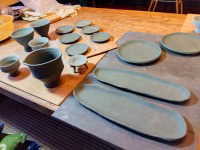 前回に成形したものの底削りはすでに完了しています。今回は酒器セットや高い高台のカップ、丸皿、長皿、丸小皿などを成形しました。深海ブルーの色に合う形とその器の使い道を思案しながらの成形です。この粘土は成形はそこそこしやすいのですが、乾燥がなかなか進まなくて柔らかい状態が続き、いざ乾燥し始めるとかなり速いペースで硬化してくるので目が離せません。皿物は反りが出にくいので有難いです。土もいろいろ癖があります。素焼きの窯詰めのためにはまだ半分というところでしょうか。さらに思案は続きます。