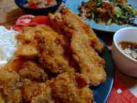 | 南オーストラリアの赤。千円以下で買えるワイン。ボトルのガラスも薄く、軽く気軽に飲むワインという設定。期待せずに開栓。色はそこそこ濃い。少し甘めの酸からスタート。10分で思いに反して果実味押しになってしまった。やはりもう少し酸押しの展開にしてほしい。鶏もも肉の油淋鶏風。だしで薄く味付けしたもも肉をソフトに揚げ、酢、醤油、砂糖、胡麻油、生姜すりおろしにきゅうりのみじん切りを入れたたれを掛けて食しました。鶏肉は安くて便利ですが、飽きてくるので酢を効かすと食欲が増します。 |