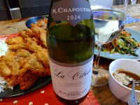フランス北ローヌの赤。シラー50%、グルナッシュ40%、ムールヴェードル10%。ギガルのネゴシアンもの。シラー50%というシラー主体のワイン。大樽で1年半の熟成という丁寧な造りに期待して抜栓。透明度は中程度ですがそそられる色合い。樽香もよし。タンニンがしっかり。酸は少し甘めですが程よい味わいでよいバランスです。ただし20分もすると果実味押しに変身するのでそのつもりで飲むのがよいかも。鶏もも肉の唐揚げの梅だれかけ。梅肉(自家製梅)、大葉、酒、だしのたれでさっぱりとした味わいに。揚げ麺の中華餡かけも蒲鉾を入れて色合いもOK。