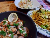 チリ、カサブランカヴァレーの赤。ピノ・ノワール100%。20年ほど前はよく飲んでいましたが超ご無沙汰のワインです。2016年のコメントと同じく、薄めの色合いで味わいも薄く、後味に液体の冷たさが残る冷ややかな印象ですが、この価格にしては出来は相当よいように思えます。10分もすると酸の高まりが感じられ、きれいでチャーミングな酸の味を楽しめました。豚ヒレ肉のレモンステーキ。レモンの酸ですっきりの味わいのステーキです。ポテトサラダも胡椒をしっかりと効かしてスパイシーに。